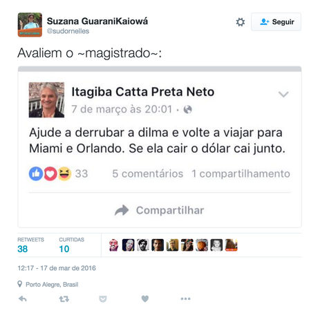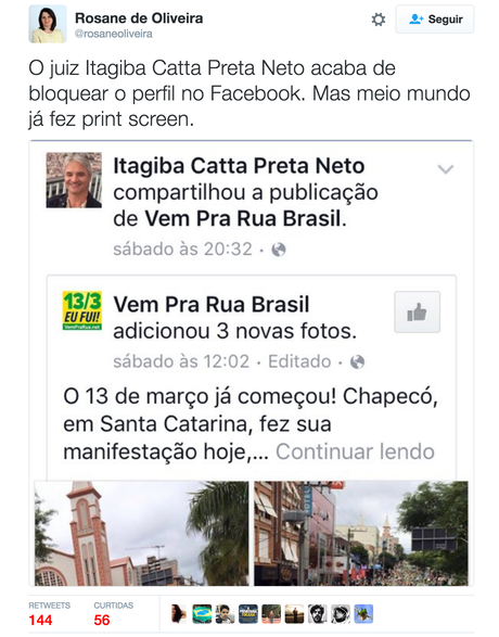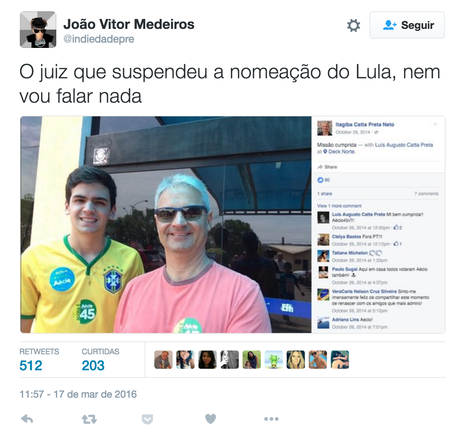 Minutos após o anúncio de que o juiz havia suspendido a nomeação de Lula, participantes de redes sociais encontraram a página pessoal dele no Facebook – agora tirada do ar –, na qual Catta Preta documentava sua presença em protestos contra o governo Dilma nos últimos meses. Em outra foto, ele aparece com um distintivo do candidato do PSDB à Presidência em 2014, Aécio Neves.