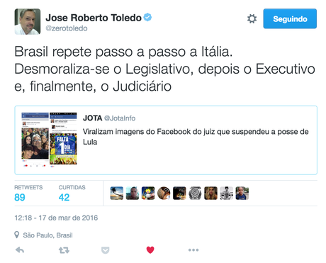 O jornalista José Roberto Toledo, colunista de política do jornal Estadão , comparou a progressão do caso à Operação Mãos Limpas, na Itália, afirmando que o poder Judiciário "se desmoralizou", após o poder Executivo e o poder Legislativo.